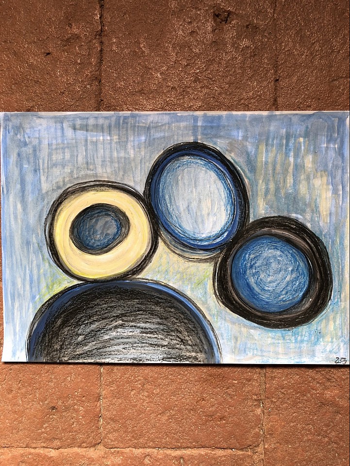 Forme tonde, spiraliformi, organiche in espansione, forme colore che si cercano, si rincorrono e volte si toccano o sovrappongono cercando l’ordine nel caos.